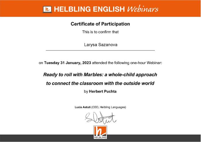 Завідувачка кафедри іноземних мов факультету №4 ХНУВС Олена Статівка та викладачі цієї ж кафедри Валентина Почуєва, Лариса Сазанова, Олег Гончарук та Артем Білоусов взяли участь у міжнародному онлайн-вебінарі “Ready to roll with Marbles: a whole-child approach to connect the classroom with the outside world” та ознайомилися з практичними посібниками видавництва Helbling English. Спікер заходу Герберт Пухта є автором інноваційних підручників та мультимедійних матеріалів, які роблять вивчення англійської мови як іноземної цікавим, підвищують мотивацію, задовольняють різні інтереси й стилі навчання. За результатами заходу викладачі отримали корисну інформацію стосовно сучасних джерел навчання іноземної мови та сертифікати учасника.