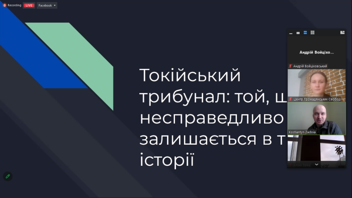 Під час лекції доповідач – експерт Центру громадянських свобод, професор кафедри кримінально-правової політики та кримінального права Київського національного університету імені Тараса Шевченка, кандидат юридичних наук, доцент Костянтин Задоя наголосив, що Міжнародний військовий трибунал для Далекого Сходу, також відомий як Токійський трибунал – суд над японськими воєнними злочинцями, проходив у Токіо з 3 травня 1946 р. по 12 листопада 1948 р. Він був тривалішим, аніж Нюрнберзький процес. Обвинувальний висновок у справі 28 головних японських воєнних злочинців було складено від імені США, Китаю, Великої Британії, СРСР, Австралії, Канади, Франції, Нової Зеландії, Нідерландів, Індії та Філіппін.