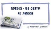 В українському календарі Всесвітній день поезії вперше з’явився у 2004 році. На весь світ і різними мовами звучать ліричні сонети Вільяма Шекспіра і Франческо Петрарки, пророчі слова Тараса Шевченка, чарівна жіноча поезія Лесі Українки, могутнє слово Івана Франка, неперевершені твори Ліни Костенко, Василя Симоненко, Василя Стуса, Бориса Олійника, Павла Тичини. Ці імена входять в наше життя з дитинства і залишаються з нами назавжди. Поезія... Вона втішить, пригорне, приголубить і проникне в таємниці людської душі... Кожний знаходить в ній щось своє, близьке і зрозуміле.