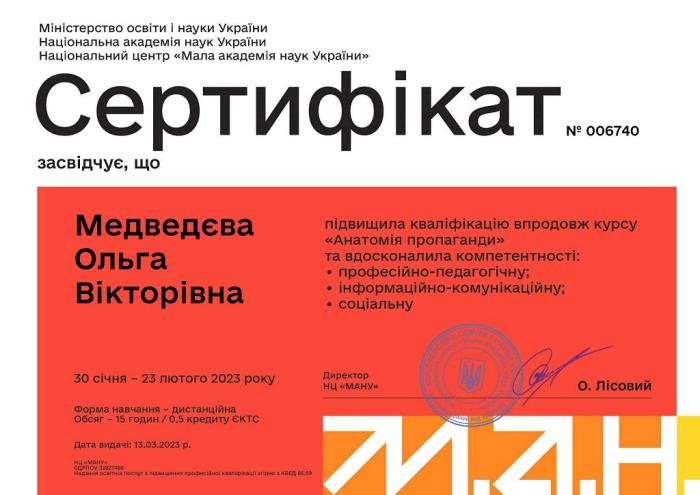 Доцентка кафедри педагогіки та психології факультету № 3 Харківського національного університету внутрішніх справ Ольга Медведєва пройшла підвищення кваліфікації в межах спецкурсу «Анатомія пропаганди», який було організовано в межах програми професійного розвитку педагогів від Національного центру «Мала академія наук України» Міністерства освіти та науки України.