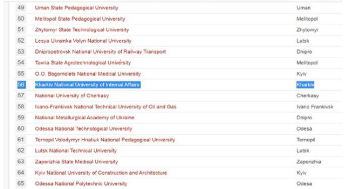 Серед ЗВО МВС, які увійшли до рейтингу, як і торік, – три університети: ХНУВС, ДДУВС і ЛДУВС. Харківський національний університет внутрішніх справ має найкращий результат, посідає 56 місце (піднявшись на 19 сходинок) зі 181 українського університету.
