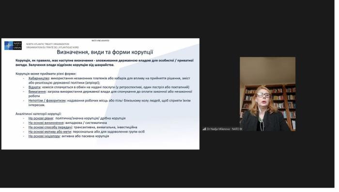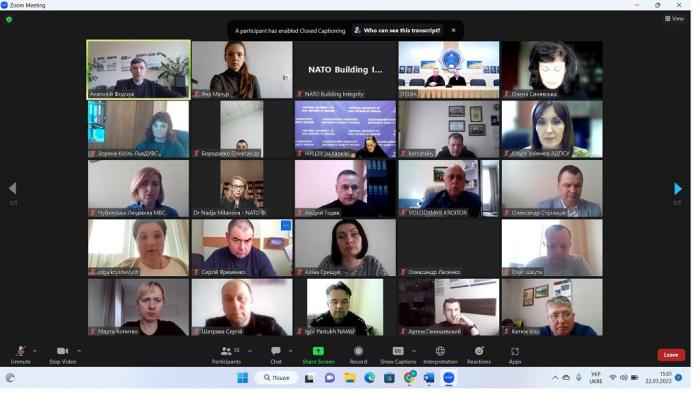 Доцент кафедри адміністративного права та процесу факультету № 1 підполковник поліції Олександр Пабат, завідувач науково-дослідної лабораторії з проблем досудового розслідування Сергій Шатрава, професор кафедри правоохоронної діяльності та поліціїстики факультету № 6 Олена Синявська, професор кафедри цивільного права та процесу факультету № 6 Володимир Кройтор, доцент кафедри цивільного права та процесу факультету № 6 Елла Твердохліб та уповноважена з антикорупційної діяльності Яна Мазур взяли участь в онлайн-семінарі щодо виховання доброчесності, що був організований МВС спільно з Програмою НАТО з виховання доброчесності. В інформаційному заході також взяли участь представники МВС України, Міжнародного Секретаріату НАТО та Представництва НАТО в Україні.