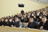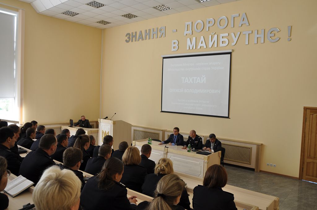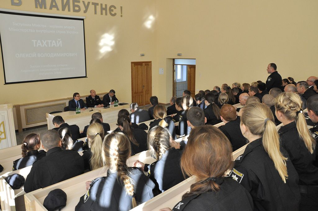 Представники міністерства і ректор навчального закладу Валерій Сокуренко зустрілися з постійним та перемінним особовим складом університету. Вітаючи аудиторію, заступник міністра Олексій Тахтай зазначив, що в міністерстві добре знають діяльність Харківського національного університету внутрішніх справ, пишаються його випускниками та досягненнями колективу, і запропонував присутнім поспілкуватися на теми, які сьогодні є найбільш актуальними для працівників та курсантів навчального закладу.