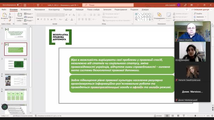Юлія Іваненко надала практичні поради щодо підготовки письмових робіт студентами та необхідності приділяти увагу письмовим навичкам, адже саме вони є основною фаховою ознакою юриста. Надана інформація була цікавою і змістовною, тому представники Сумського місцевого центру з надання БВПД й надалі будуть запрошуватися для проведення бінарних занять зі студентами університету.