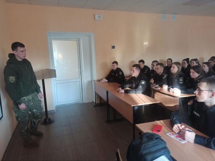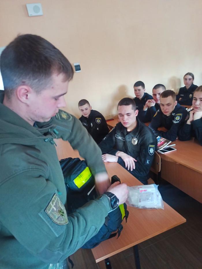 Працівник поліції детально розповів здобувачам вищої освіти про особливості надання першої домедичної допомоги у зоні прямої загрози, про правила особистої безпеки. Офіцер поліції продемонстрував складові тактичного рюкзака, який сьогодні використовують медики на полі бою. Інспектор звернув увагу курсантів на важливість чіткого розуміння та виконання алгоритму дій, що допоможе надати першу допомогу постраждалому та зберегти йому життя.
