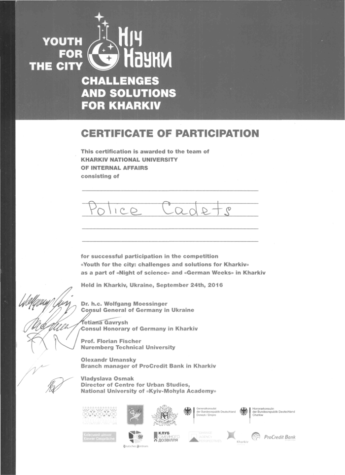 Відбувся круглий стіл англійською мовою «Молодь для міста: проблеми та рішення для Харкова». Під час проведення заходу завідувач кафедри психології і педагогіки факультету № 3 Харківського національного університету внутрішніх справ доктор педагогічних наук, професор Олена Федоренко, доцент кафедри, кандидат психологічних наук, доцент Світлана Харченко разом із курсантами представили проект «Кадети поліції».