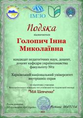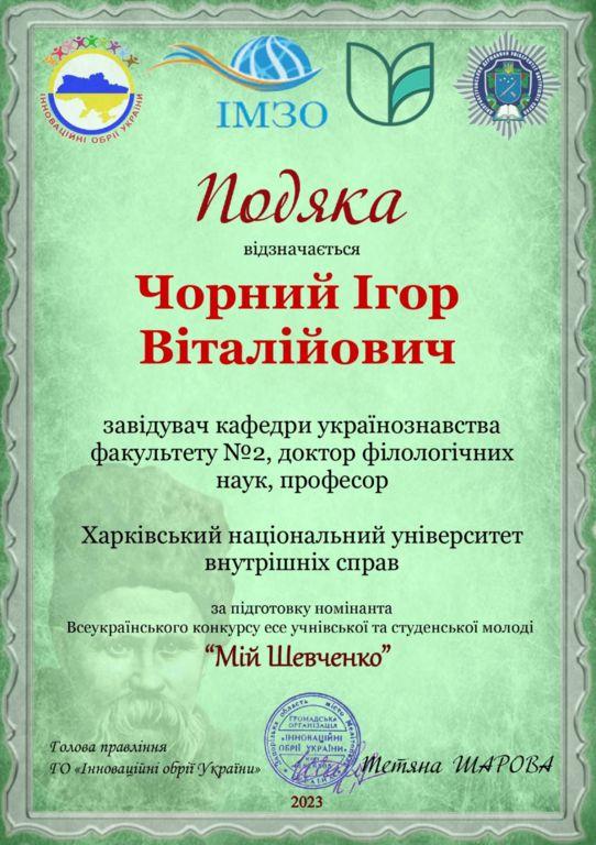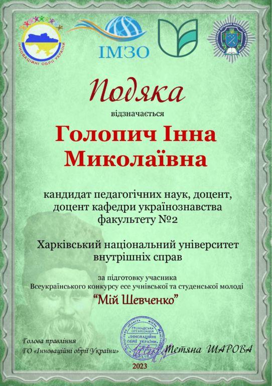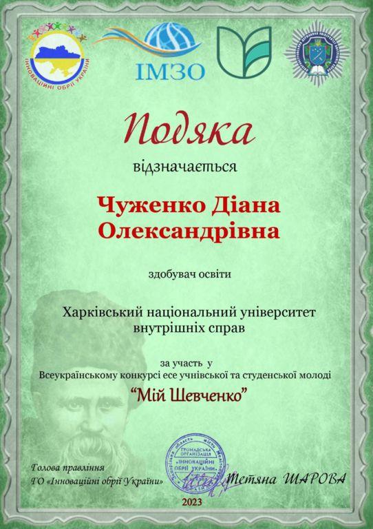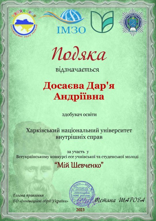 Напередодні 209-ї річниці від дня народження Великого Кобзаря Громадська організація «Інноваційні обрії України» провела Всеукраїнський конкурс есе «Мій Шевченко». Метою конкурсу є актуалізація пам’яті про Тараса Шевченка та його ролі у закладанні духовних основ української нації, національно-патріотичне виховання здобувачів освіти, збереження і розвиток інтелектуального потенціалу України, підтримка і стимулювання талановитої молоді і творчої праці педагогів. Участь у конкурсі взяли й курсанти Харківського національного університету внутрішніх справ за керівництва викладачів кафедри українознавства факультету №2.