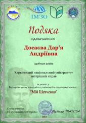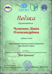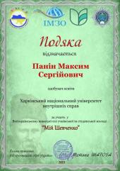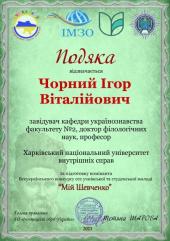 Вітаємо переможницю в номінації «Психологічні аспекти творчості Тараса Шевченка» (науковий керівник – завідувач кафедри українознавства Ігор Чорний) курсантку факультету №3 Поліну Рог, а також курсантів, які отримали подяки від оргкомітету: Дар’ю Досаєву (факультет №2), Максима Паніна та Діану Чуженко (факультет №4) (науковий керівник – доцентка кафедри українознавства Інна Голопич).