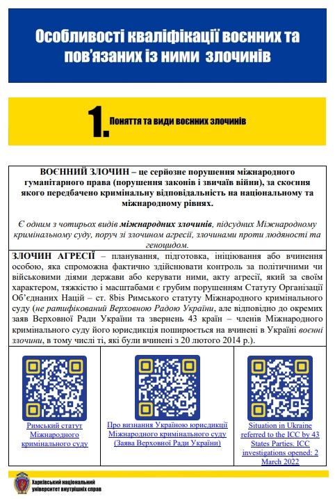 Крім того, видання містить систематизовану інформацію про найбільш поширені типові ситуації вчинення воєнних злочинів на території України та відповідну кримінально-правову кваліфікацію артилерійських і ракетних обстрілів; атак з використанням БПЛА; мінувань; заподіянь смерті та викрадень людей; незаконного позбавлення волі, катувань, зґвалтувань та сексуального насильства; незаконного заволодіння майном цивільного населення, підприємств, установ, організацій на тимчасово окупованій території, на полі бою тощо.