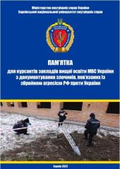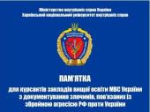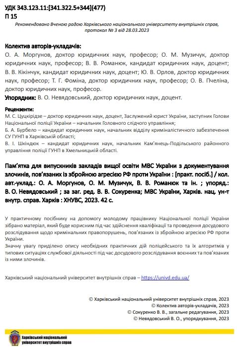 За загальною редакцією ректора Харківського національного університету внутрішніх справ, член-кореспондента Національної академії правових наук України, доктора юридичних наук, професора, заслуженого юриста України Валерія Сокуренка вийшов друком, підготовлений науковцями ХНУВС, практичний посібник «Пам’ятка для курсантів закладів вищої освіти МВС України з документування злочинів, пов’язаних із збройною агресією РФ проти України».
