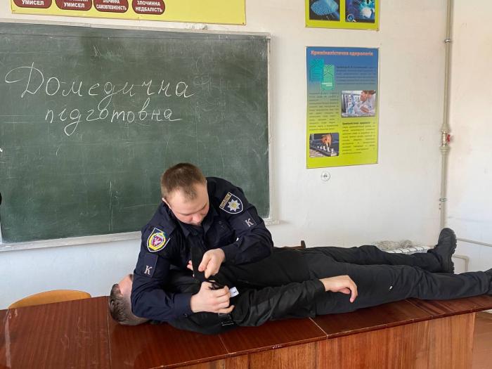 Для курсантів випускних курсів факультету №1 Харківського національного університету внутрішніх справ доцент кафедри криміналістики, судової експертології та домедичної підготовки Василь Корнієнко провів практичне заняття з тактичної медицини. Захід проведено за участю декана факультету №1 кандидата юридичних наук, доцента Віталія Романюка. Майбутні працівники поліції відпрацювали правильність накладання кровоспинного турнікету при різних видах і локалізації поранень, а також тактику та методику надання пораненим першої домедичної допомоги.