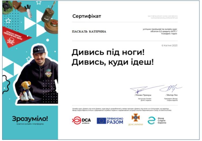 Курсантки факультету № 2 Харківського національного університету внутрішніх справ Катерина Паскаль, Марія Грідіна та Орина Лучникова під керівництвом кураторки групи доцентки кафедри соціальних та економічних дисциплін, кандидатки економічних наук, доцентки Марини Петченко успішно пройшли онлайн-курс на тему «Дивись під ноги! Дивись, куди ідеш!» на освітній онлайн-платформі «Зрозуміло!».