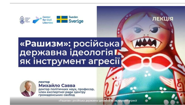 Під час лекції доктор політичних наук, професор, член експертної ради Центру громадянських свобод Михайло Савва наголосив, що упродовж тривалого часу в Росії панував авторитарний режим, але з 24 лютого 2022 року, коли почалося широкомасштабне збройне вторгнення Росії в Україну, дедалі активніше використовується термін «рашизм». Цей термін виник від поєднання двох слів: «фашизм» та «раша». Особливу увагу доповідач приділив розкриттю основних ознак російської державної ідеології та її ролі в агресії РФ проти України.