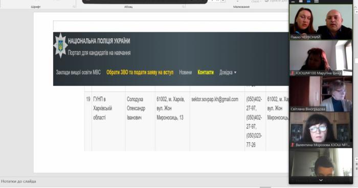 Начальниця відділу рекрутингу та організації профорієнтаційної роботи Олена Чорноус і доцент кафедри педагогіки та психології факультету №3 Павло Червоний провели онлайн-зустріч із випускниками загальноосвітньої школи №100 ім. А.С. Макаренка м. Харкова. Учасниками зустрічі стали як випускники школи, так і їхні батьки. Підключилися до заходу понад 20 локацій. Павло Червоний зосередив увагу на особливостях навчання на факультеті №3, який здійснює підготовку фахівців за напрямами «Правоохоронна діяльність» та «Психологія». За допомогою слайдів учні дізналися, як на порталі osvita.np.gov.ua заповнити анкету кандидата на навчання, також доцент кафедри відповів на запитання школярів щодо комплексної силової вправи, як складової частини екзамену з фізичної підготовленості для абітурієнтів. Олена Чорноус розповіла про умови та порядок вступу до вишу, про перспективи подальшого працевлаштування у практичних підрозділах Національної поліції України. Старшокласники також отримали інформацію щодо зворотного зв’язку з кожним факультетом Харківського поліцейського вишу.