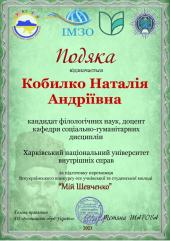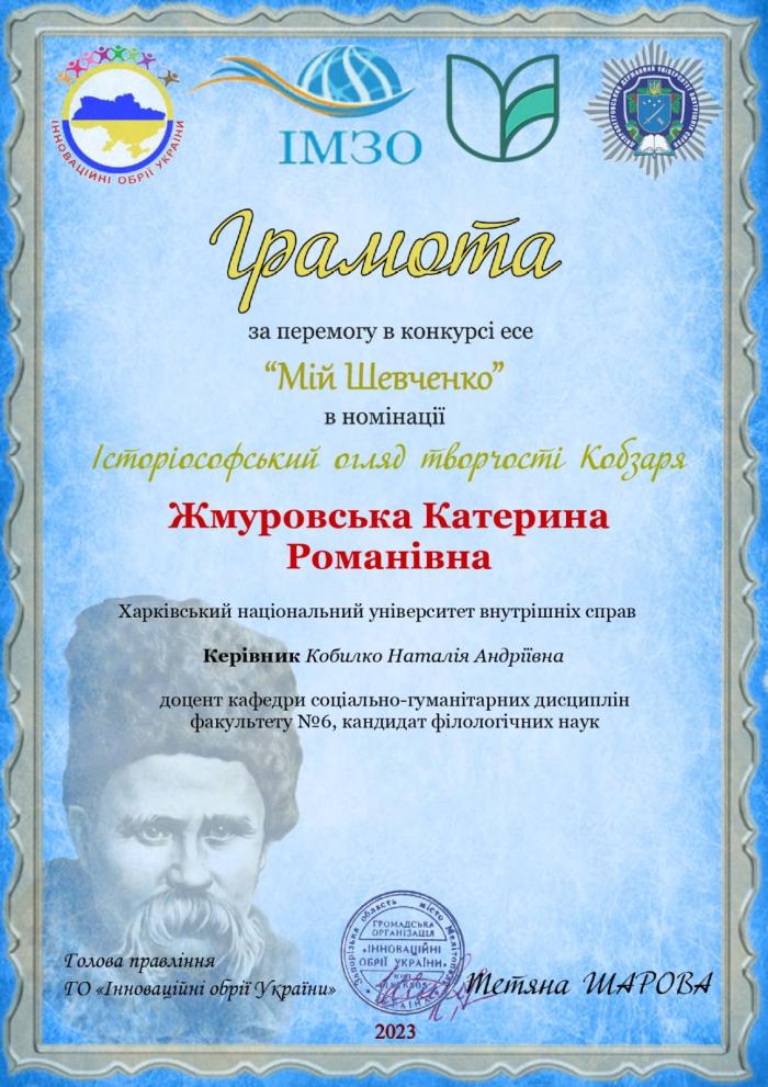 «Громадська організація «Інноваційні обрії України» засвідчує Вам свою повагу й захоплення компетентністю та професіоналізмом співробітників Вашого закладу освіти. У цей непростий для нашої держави час працівники очолюваного Вами закладу освіти роблять потужну справу: беруть активну участь у Всеукраїнському конкурсі есе учнівської та студентської молоді «Мій Шевченко», долучаючи до нього сучасну молодь, тим самим пропагуючи українське слово, патріотично налаштовуючи юне покоління, возвеличуючи Кобзаря як символ нашої духовності.