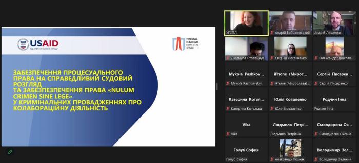 Під час вебінару спікер Андрій Лещенко – керуючий партнер адвокатського об’єднання «Прайм Юріс», випускник освітнього курсу Української Гельсінської спілки прав людини «Стандарти прав людини в діяльності адвокатів та суддів» – зазначив, що під час міжнародного збройного конфлікту особливо актуальним є дотримання прав сторін кримінального провадження у справах про колабораційну діяльність.