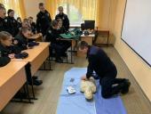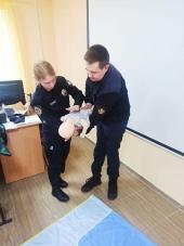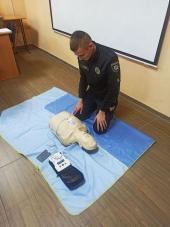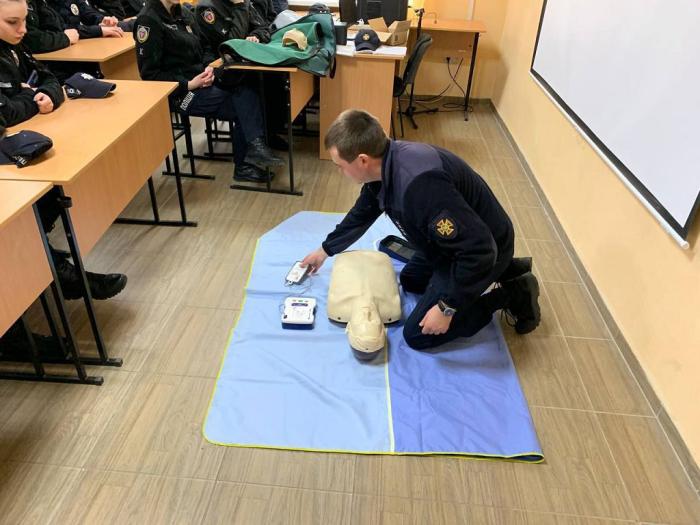 На практичному занятті Віктор Кулібаба розповів курсантам про основні правила первинної оцінки постраждалих на місці події, особливості проведення серцево-легеневої реанімації у дорослих із використанням зовнішнього автоматичного дефібрилятора, надання домедичної допомоги немовлятам при порушенні прохідності дихальних шляхів.