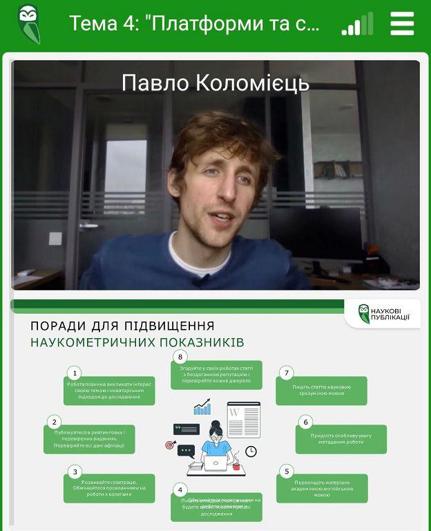 Протягом чотирьох навчальних блоків спікер Павло Коломієць разом з учасниками розглянули актуальні питання щодо розвитку сучасної української наукометрії; визначення головних вимог до публікаційної активності вченого в міжнародних наукометричних базах даних, тонкощів роботи з наукометричними базами Scopus та Web of Science; підвищення наукометричних показників вчених. Також були розкриті головні проблеми, з якими стикаються українські науковці у процесі написання статей для зарубіжних журналів, самостійного пошуку платформи для публікації тощо.