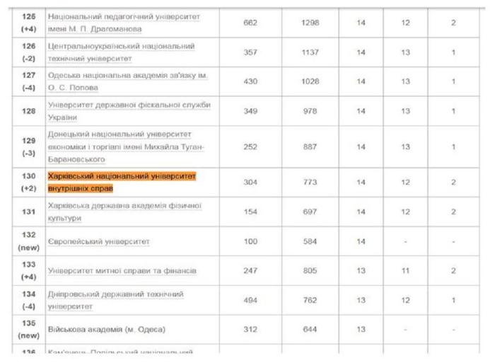 Найвищий індекс Гірша серед закладів вищої освіти МВС, які здійснюють підготовку поліцейських, має Харківський національний університет внутрішніх справ. Він, піднявшись на дві сходинки, посів 130 місце.