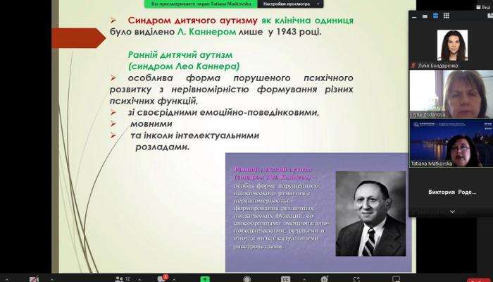 Для студентів третього курсу факультету № 6, які навчаються за спеціальністю «Психологія», лікарка-психіатр вищої категорії, кандидат медичних наук, старший науковий співробітник відділення психіатрії ДУ «Інститут охорони здоров’я дітей та підлітків НАМН України» Тетяна Матковська разом із доцентом кафедри соціології та психології вишу Іриною Ждановою провели дистанційне бінарне заняття на тему «Розлади психіки спектру аутизму у дитячому віці». Під час зустрічі здобувачі вищої освіти дізналися про етіологію, патогенез, клінічні прояви, динаміку, прогноз, особливості діагностики та терапії розладів спектру аутизму. Розповідь лектора супроводжувалася презентацією, наводилися клінічні приклади. Студенти виявили зацікавленість темою й ставили багато запитань.