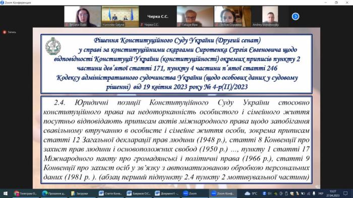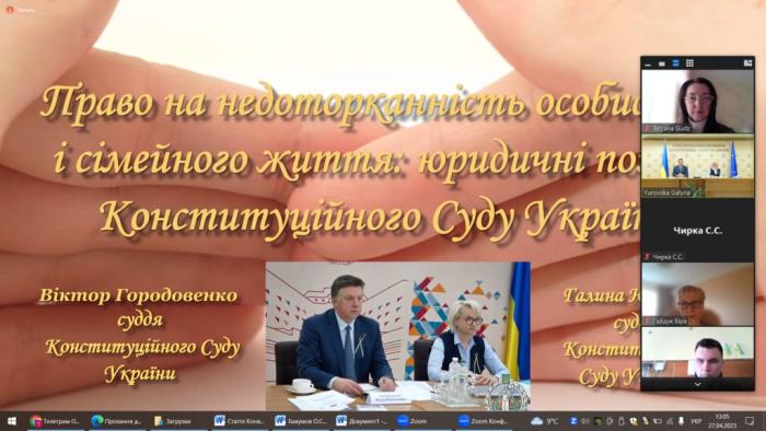Лекцію проводили судді Конституційного Суду України Віктор Городовенко та Ганна Юровська, які поділилися своїми знаннями та досвідом щодо права на недоторканність особистого і сімейного життя, а також розглянули юридичні позиції Конституційного Суду України з цього питання, сформовані з урахуванням практики Європейського суду з прав людини.