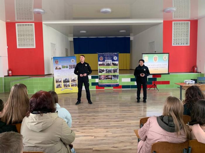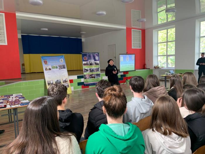 Заступник декана факультету №4 з навчально-методичної роботи Юрій Онищенко, доцентка кафедри соціальних та економічних дисциплін факультету №2 Оксана Мельничук, провідна фахівчиня факультету №1 Лілія Жиронкіна та курсанти університету відвідали м. Сокиряни Чернівецької області, де провели зустріч із випускниками навчальних закладів Сокирянської територіальної громади. Захід відбувся за сприяння начальниці відділу освіти Сокирянської міської ради Дністровського району Галини Рябко та директора ЗЗОШ І-ІІІ ступенів №1 м. Сокиряни Андрія Ткача.