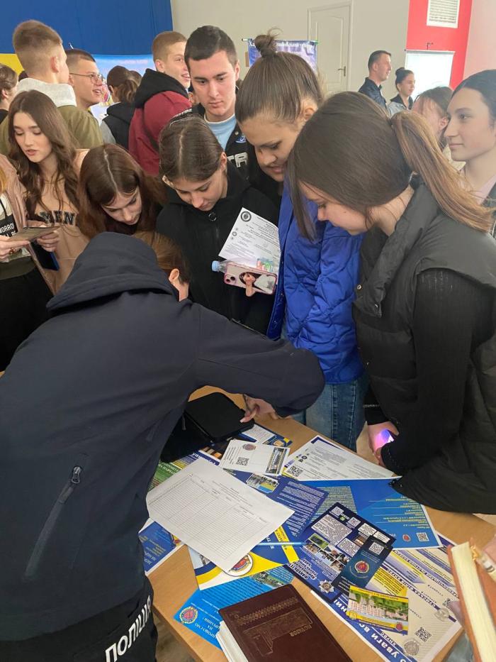Представники університету ознайомили присутніх з історією університету, його відомими випускниками. Майбутні вступники дізналися про цьогорічні умови вступу як за державним замовленням, так і за кошти юридичних і фізичних осіб, про перспективи подальшого працевлаштування. Для старшокласників у презентаційному форматі було докладно наведено покроковий алгоритм дій абітурієнта при вступі до закладу вищої освіти. У профорієнтаційному заході взяли участь більше 80 учнів. Курсанти також поспілкувалися з випускниками шкіл, розповіли їм про навчання та службу, поділилися власним досвідом вступу до Харківського поліцейського вишу.