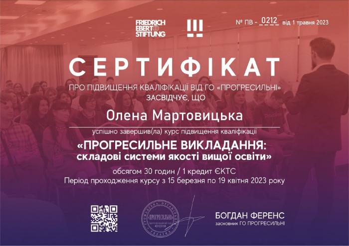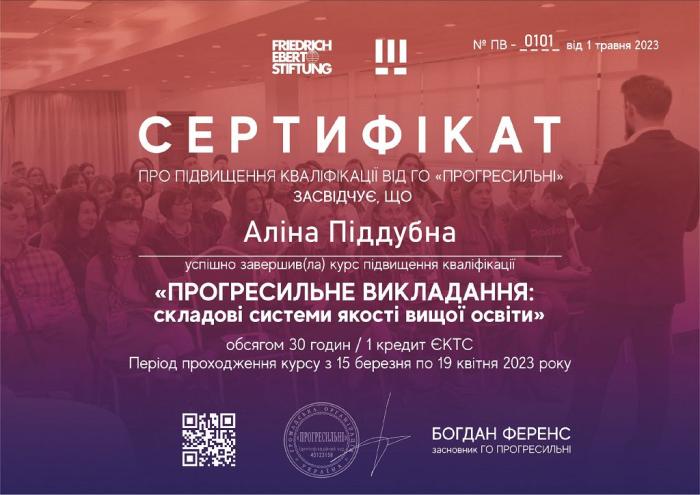 З метою підвищення рівня педагогічної майстерності представниці кафедри кримінального процесу та організації досудового слідства факультету №1 – завідувачка кафедри Тетяна Фоміна, доцентки кафедри Олена Мартовицька та Аліна Піддубна, викладачки Ірина Нечаєва та Катерина Горбунова пройшли підвищення кваліфікації від ГО «Прогресильні» за темою «Прогресильне викладання: складові системи якості вищої освіти». Під час заходу розглядались питання академічної доброчесності, інституційного забезпечення якості освітнього процесу, умов інклюзивного навчання, Lifelong learning для викладача.