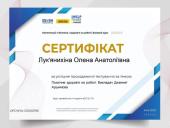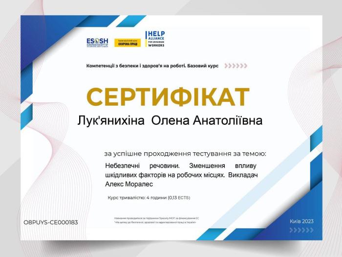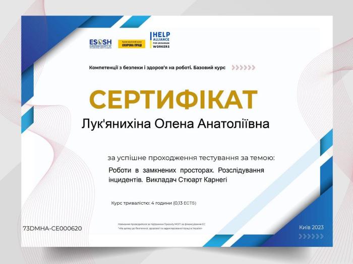 Також Олена Лук’янихіна відвідала низку вебінарів для України: «Компетенції з безпеки праці. Базовий курс» у межах проєкту МОП «На шляху до безпечної, здорової та задекларованої праці в Україні», Європейського співтовариства фахівців з охорони праці (ESOSH), Європейської організації з допомоги Україні «Help Alliance for Ukrainian Workers» та журналу «Охорона праці», за результатами тестування з яких отримала сертифікати.
