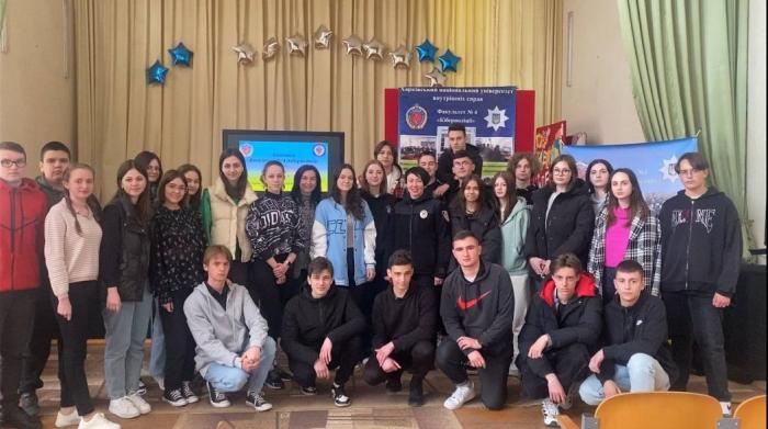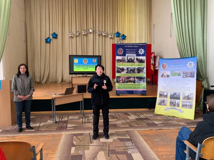 Представники університету ознайомили майбутніх вступників з історією університету, його відомими випускниками, цьогорічними умовами вступу, як на факультети за державним замовленням, так і за кошти юридичних і фізичних осіб, перспективами працевлаштування після закінчення ХНУВС. Для старшокласників у презентаційному форматі було докладно наведено покроковий алгоритм дій абітурієнта при вступі до закладу вищої освіти. Курсанти також поспілкувались із випускниками шкіл, розповіли їм про навчання, поділились власним досвідом вступу до Харківського поліцейського вишу.