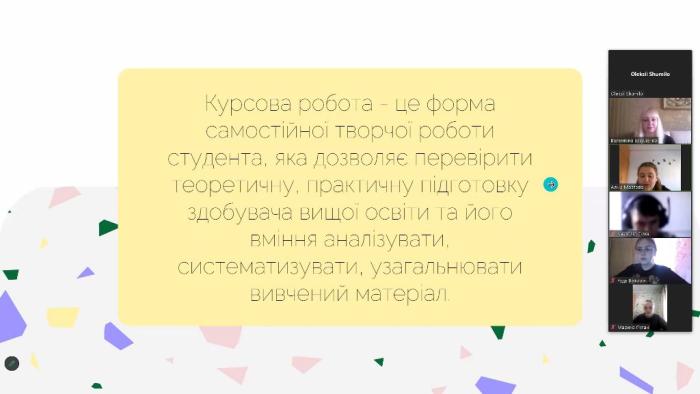 Під час заняття студентки Аліна Мозгова та Марія Колбас за допомогою підготовлених презентацій поділилися власним досвідом написання курсової роботи та розповіли про мету виконання курсової роботи; порядок її виконання; особливості оформлення титульної сторінки та літератури, а також методах дослідження.