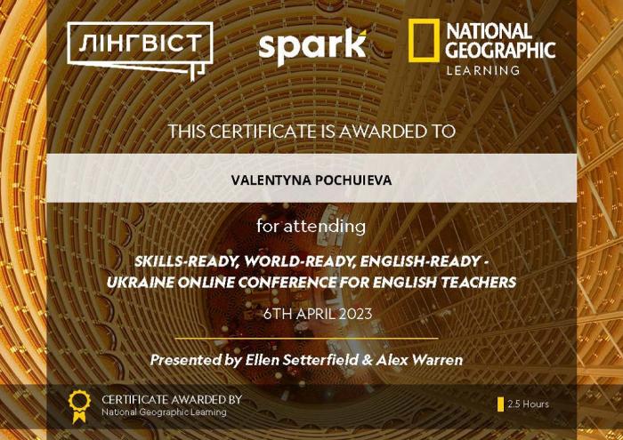 Завідувачка кафедри іноземних мов факультету № 4 Олена Статівка, доценти цієї ж кафедри Валентина Почуєва та Олег Гончарук, старша викладачка Лариса Сазанова та викладач Артем Білоусов взяли участь в онлайн-конференції для викладачів англійської мови «Skills-ready, World-ready, English-ready – Ukraine online conference for English teachers», організованій National Geographic Learning та компанією «Лінгвіст».
