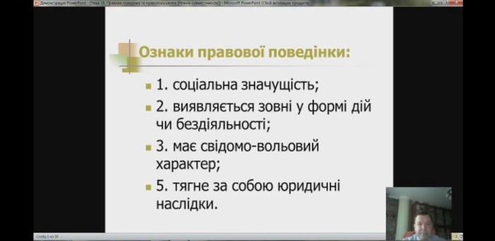Професор кафедри теорії та історії держави і права факультету №1 ХНУВС Дмитро Слинько провів лекційне заняття в онлайн режимі з учнями старших та випускних класів Харківської ЗОШ І-ІІІ ступенів №103 на тему «Правова поведінка та правопорушення». Він ознайомив старшокласників з основними видами та ознаками правової поведінки та правопорушеннями. Обговорювались питання профілактики правопорушень та інших негативних явищ у молодіжному середовищі, правила поводження в суспільстві. Наприкінці лекційного заняття лектор розповів майбутнім вступникам про факультети та спеціальності, за якими здійснюється підготовка фахівців у Харківському національному університеті внутрішніх справ. Старшокласники також дізналися про побут і дозвілля курсантів, наукові гуртки і спортивні секції, що діють у виші, про перспективи подальшого працевлаштування. Професор роз’яснив особливості вступної кампанії у 2023 році та навів алгоритм дій абітурієнта при вступі до закладу вищої освіти системи МВС.