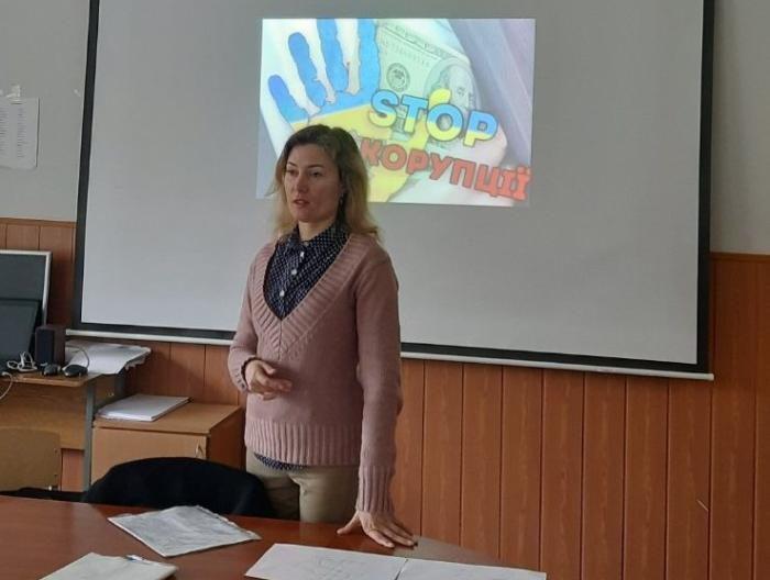 Доцентка кафедри гуманітарних дисциплін Сумської філії ХНУВС Ганна Довгополова та курсанти-першокурсники на кураторській годині обговорили теоретичні та практичні підґрунтя корупції як соціального явища, визначили чинники, які зумовлюють її поширення, а також ознайомилися з невтішною статистикою щодо поширення корупції в різних сферах суспільних відносин.