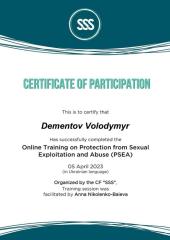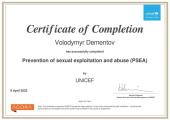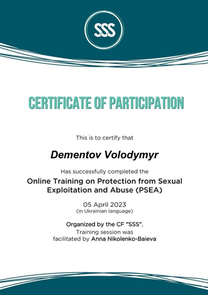 У межах реалізації Плану Харківського національного університету внутрішніх справ з виконання Державної соціальної програми запобігання та протидії домашньому насильству та насильству за ознакою статі на період до 2025 року доцент кафедри соціально-економічних дисциплін Сумської філії ХНУВС кандидат наук з державного управління Володимир Дементов успішно підвищив кваліфікацію – опанував декілька онлайн-курсів на тему «Запобігання сексуальній експлуатації та насильству» (Prevention of Sexual Exploitation and Abuse (PSEA). Він отримав відповідні електронні сертифікати: UNDSS (Департаменту охорони та безпеки Організації Об’єднаних Націй); SSS (Благодійна організація «Благодійний фонд «СТАБІЛІЗЕЙШЕН СУППОРТ СЕРВІСЕЗ» – виконавчий партнер The Office of the United Nations High Commissioner for Refugees («UNHCR») – Управління Верховного Комісара у справах біженців (УВКБ ООН); UNICEF (ЮНІСЕФ – дитячий фонд ООН, спеціалізована структура ООН із захисту прав та інтересів дітей); на платформі DisasterReady (онлайн навчальна платформа https://www.disasterready.org/ створена для кращої підготовки гуманітарних спеціалістів і фахівців у сфері розвитку до важливої роботи, яку вони виконують, з основних гуманітарних навичок).