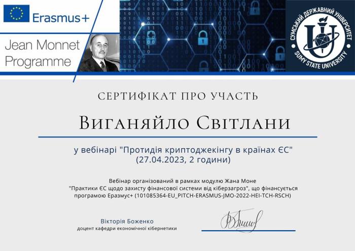 Доцентки кафедри соціально-економічних дисциплін Сумської філії ХНУВС Світлана Петровська, Людмила Парфентій та Світлана Виганяйло взяли участь у вебінарі «Протидія криптоджекінгу в країнах ЄС», що був проведений у межах проєкту Erasmus+ Jean Monnet «Практики ЄС щодо захисту фінансової системи від кіберзагроз».