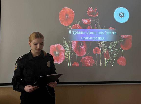Для курсантів 1 курсу Сумської філії Харківського національного університету внутрішніх справ було організовано та проведено інформаційно-просвітницьку годину, присвячену Дню пам’яті і примирення та Дню перемоги над нацизмом у Другій світовій війні 1939-1945 рр. Курсантка 1 курсу Ангеліна Правдюк ознайомила здобувачів із інформаційним матеріалом Українського інституту національної пам’яті.