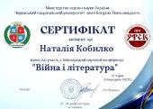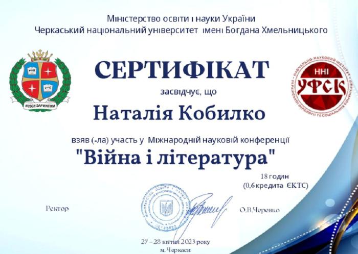 Доцентка кафедри соціально-гуманітарних дисциплін факультету № 6 кандидатка філологічних наук Наталія Кобилко взяла участь у Міжнародній науковій конференції «Війна і література», організованій і проведеній Черкаським національним університетом імені Б. Хмельницького. Захід відбувся у змішаному форматі: аудиторно та на платформі Google Meet. Науковці з усієї України плідно працювали протягом двох днів, досліджуючи такі літературознавчі проблеми, як універсальні смисли мілітарної теми в художній літературі та специфічні особливості відтворення сучасної російсько-української війни; війна як конфлікт пам’ятей; образи української людини (воїн-захисник, волонтер, біженець, переселенець) і ворога в художніх творах; сучасна війна і народна література.