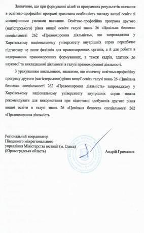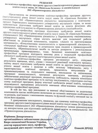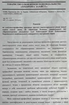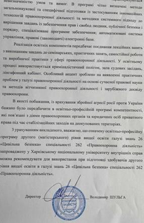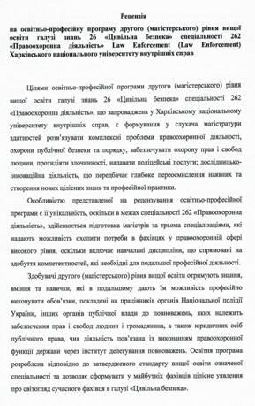 Гарант освітньо-професійної програми другого (магістерського) рівня вищої освіти Олена Джафарова звернула увагу, що в зазначених освітньо-професійних програмах враховано пропозиції, які надійшли від кафедр університету, здобувачів вищої освіти, курсантсько-студентського Парламенту, а також стейкхолдерів (ГУНП у Вінницькій області, ГУНП в Харківській області, Бюро економічної безпеки України, ТОВ «Охорона захист» м. Харків, Регіональний координатор південного міжрегіонального управління Міністерства юстиції (м. Одеса).