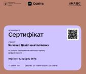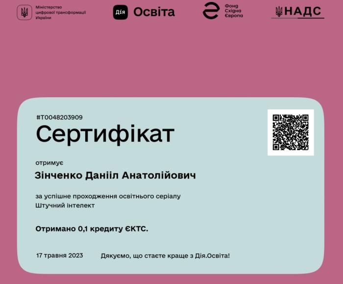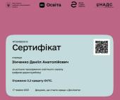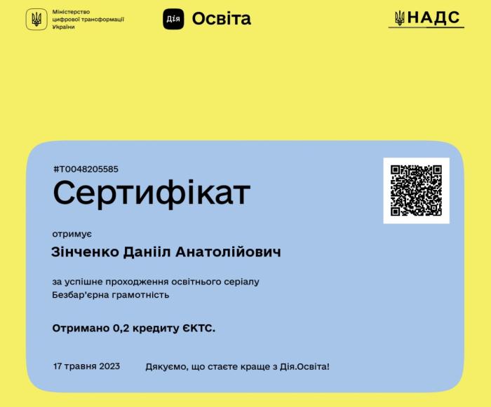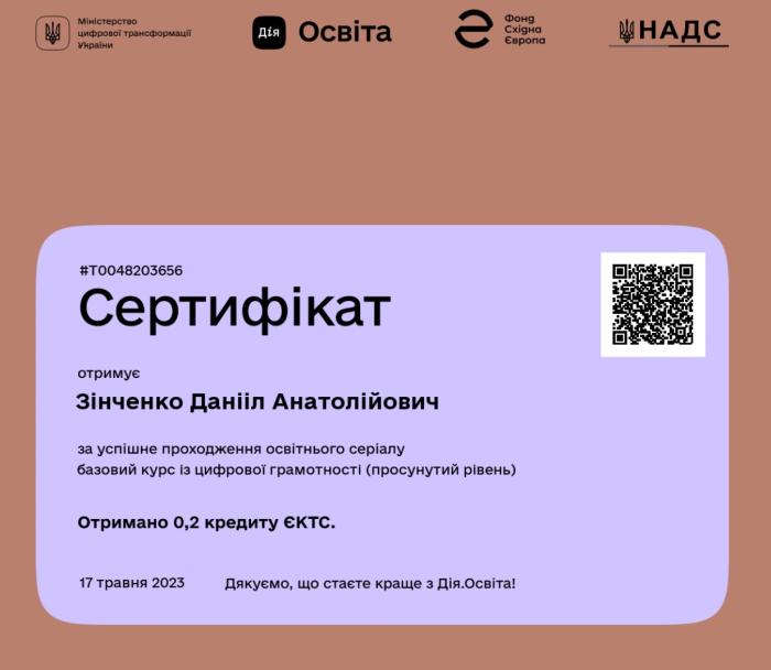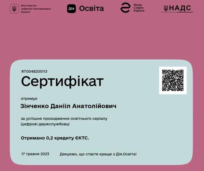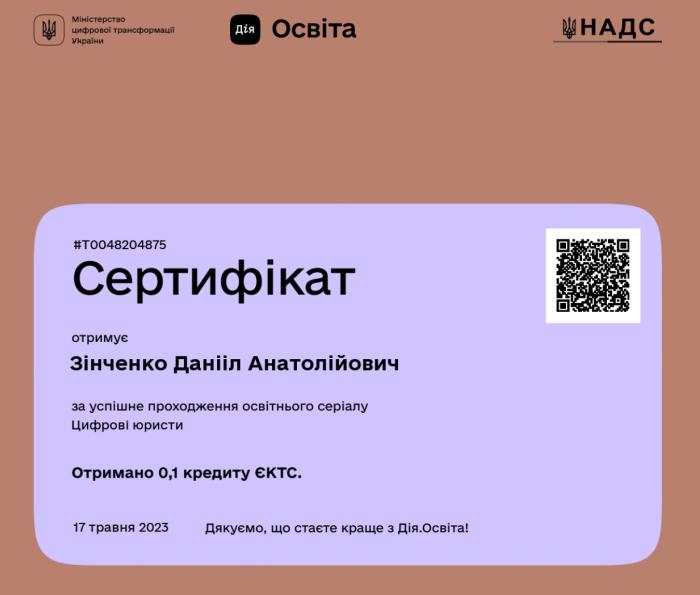 Слухач магістратури факультету № 3 старший лейтенант поліції Данііл Зінченко взяв участь у проходженні курсів на онлайн-платформі «Дія-освіта» – «Цифрова грамотність», «Цифрові держслужбовці», «Безбар’єрна грамотність», «Цифрові юристи», «Штучний інтелект», що дозволило підвищити рівень знань та навичок у відповідності зі своєю спеціалізацією.