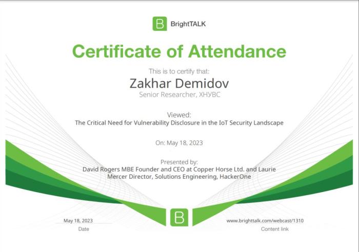 Старший науковий співробітник науково-дослідної лабораторії з проблем інформаційних технологій та протидії злочинності у кіберпросторі Харківського національного університету внутрішніх справ Захар Демидов взяв участь у вебінарі «Критична потреба у розкритті вразливостей у сфері безепеки ІоТ («The Critical Need for Vulnerability Disclosure in the IoT Security Landscape»).