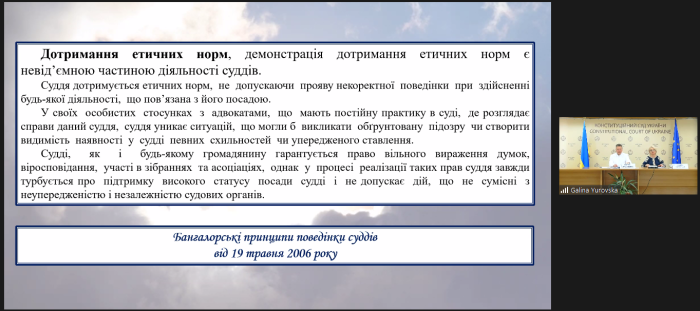 Під час лекції доповідачі поінформували про зміст Висновку 25 (2022) Консультативної ради європейських суддів, який містить основні аспекти самовираження поглядів суддів. У документі, зокрема, йдеться про правовий та етичний обов’язок судді висловлюватися з метою захисту верховенства права та демократії на національному, а також на європейському й міжнародному рівнях; розглядалися питання вираження поглядів суддів, що викликають занепокоєння судової влади; суперечливі теми, що становлять суспільний інтерес, а також питання суддівської стриманості, якої необхідно дотримуватися. Було зазначено, що Висновок має на меті надати загальні рекомендації суддям і встановити широкі рамки для подальшого обговорення того, які параметри слід враховувати, коли судді користуються своїм правом на свободу вираження поглядів.