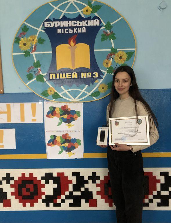 За результатами конкурсу учениця Буринської загальноосвітньої школи І-ІІІ ступенів № 3 Буринської міської ради Сумської області Вероніка Біда (ІІ місце) отримала диплом та подарунок від професорки кафедри Валентини Жорнокуй.