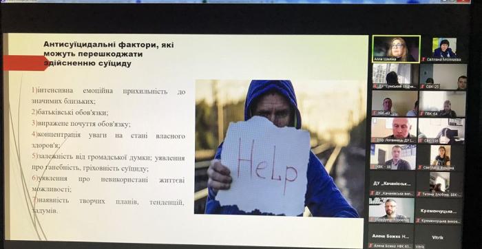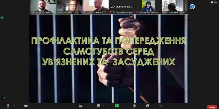 У межах заходу на тему «Профілактика та попередження самогубств серед ув’язнених та засуджених» психологи УВП та СІЗО ознайомилися із факторами ризику скоєння самогубства засудженими/ув'язненими, з характерними суіцидальними проявами у засуджених/ув’язнених, які перебувають в УВП/СІЗО та категоріями засуджених, які схильні до самогубства. Було обговорено діагностичні інструменти щодо визначення суіцидальної поведінки, а також основні області інтервенції при суіцидальній поведінці.