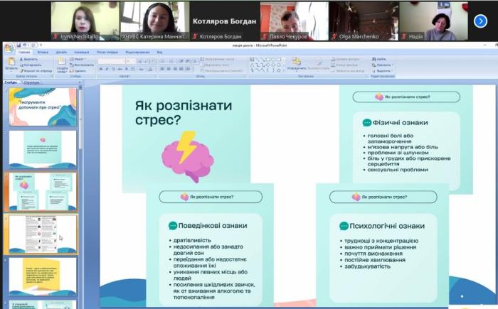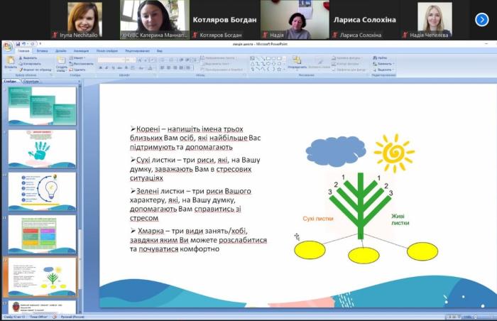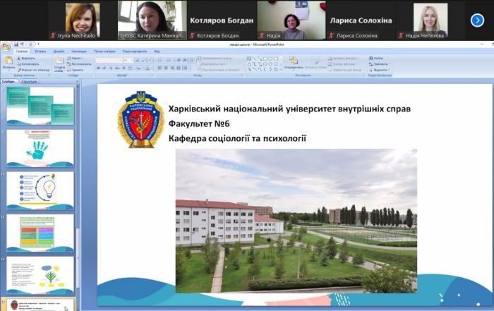 Доцентка кафедри соціології та психології факультету № 6 ХНУВС Катерина Маннапова провела онлайн лекційне заняття за темою «Інструменти допомоги при стресі» для учнів старших класів, вчителів шкіл, батьків і всіх бажаючих. Під час зустрічі було обговорено поняття стресу та симптоми його переживання. Учасників також було ознайомлено з «інструментами самодопомоги» – психологічними вправами та техніками стабілізації психоемоційного стіну. Особливу увагу було приділено методикам наснаження психологічними ресурсами – BASIC Ph та «Дерево». Наприкінці зустрічі Катерина Маннапова розповіла про особливості навчання в університеті, ознайомила з умовами та перевагами вступу до Харківського національного університету внутрішніх справ.