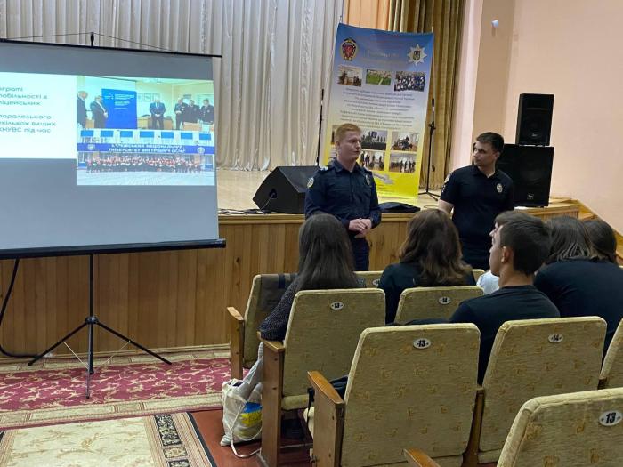 За сприяння Головного управління Національної поліції в Чернівецькій області представники Харківського національного університету внутрішніх справ зустрілись зі старшокласниками закладів середньої освіти м. Сторожинець Чернівецького району. У зустрічі взяли участь викладач кафедри конституційного та міжнародного права факультету № 4 Вадим Мальцев, провідна фахівчиня факультету № 1 Лілія Жиронкіна, голова курсантсько-студентського самоврядування курсант факультету № 4 Олександр Бабич, курсантка факультету № 1 Ольга Мельничук, представники ГУНП в Чернівецькій області – інспекторки сектору організації відбору управління кадрового забезпечення Юлія Макушенко та Ангеліна Дарійчук, старший інспектор ювенальної превенції Строжинецького відділу поліції Володимир Прокопчук. На зустрічі обговорювались особливості вступної кампанії у 2023 році.