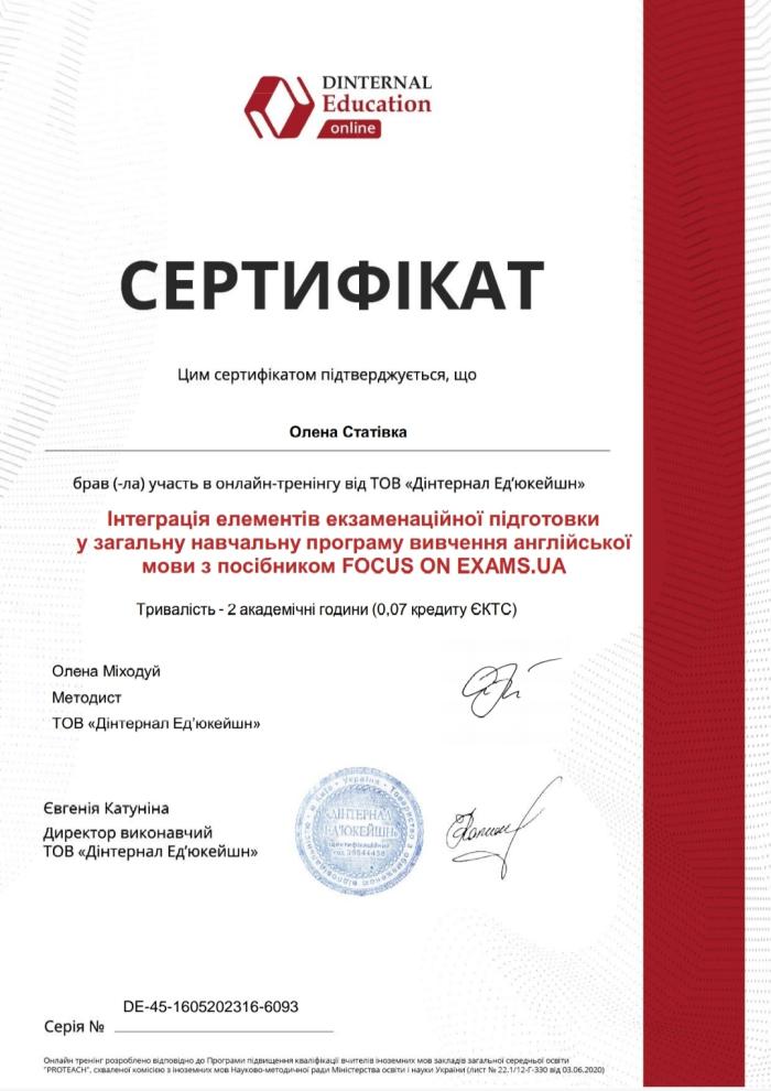 Завідувачка кафедри іноземних мов факультету № 4 ХНУВС Олена Статівка взяла участь у міжнародному онлайн-тренінгу «Інтеграція елементів екзаменаційної підготовки у загальну навчальну програму вивчення англійської мови з посібником FOCUS ON EXAMS.UA» від Міжнародного освітнього центру Dinternal Education. Викладач цієї ж кафедри Артем Білоусов відвідав тренінг «Інтенсивна підготовка до іспитів з англійської мови в старших класах з курсом Formula». На тренінгах розглядалися такі питання як: оптимальний баланс між розвитком мовленнєвої компетентності студентів і перевірка їх готовності до іспиту, занурення в мову та одночасна підготовка до іспиту, підготовка до складання ЗНО та міжнародних мовних іспитів, інструменти викладача для офлайн навчання та цифрові інструменти для онлайн навчання (для викладача та студента).
