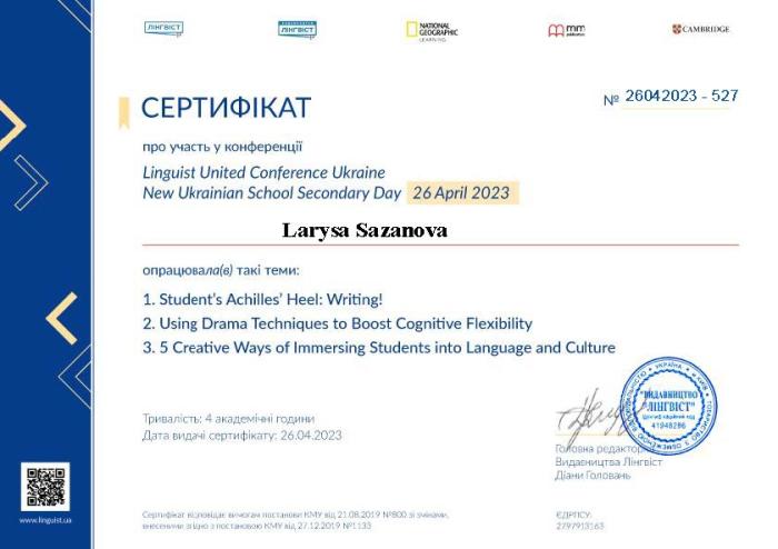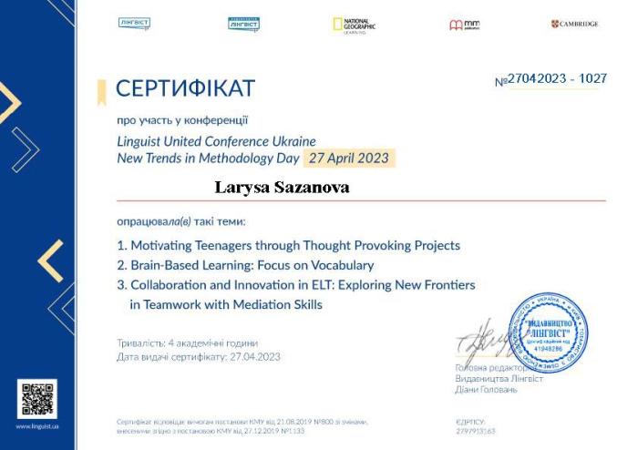 Старша викладачка кафедри іноземних мов факультету № 4 Лариса Сазанова взяла участь у міжнародній триденній конференції «Linguist United Conference Ukraine 2023», організованій та проведеній в онлайн-форматі видавництвом «Лінгвіст», Cambridge, MM Publications і National Geographic Learning. Представники міжнародних видань та українських проєктів розглянули такі питання: автентичний вміст і соціально-емоційне навчання; виховання громадянина країни та громадянина світу; позитивна психологія в первинному спілкуванні; використання техніки драми для підвищення когнітивної гнучкості; 5 творчих способів занурення студентів у мову та культуру; проєкти для підвищення мотивації; метод «мозкового штурму», формування і розвиток навичок командної роботи тощо.