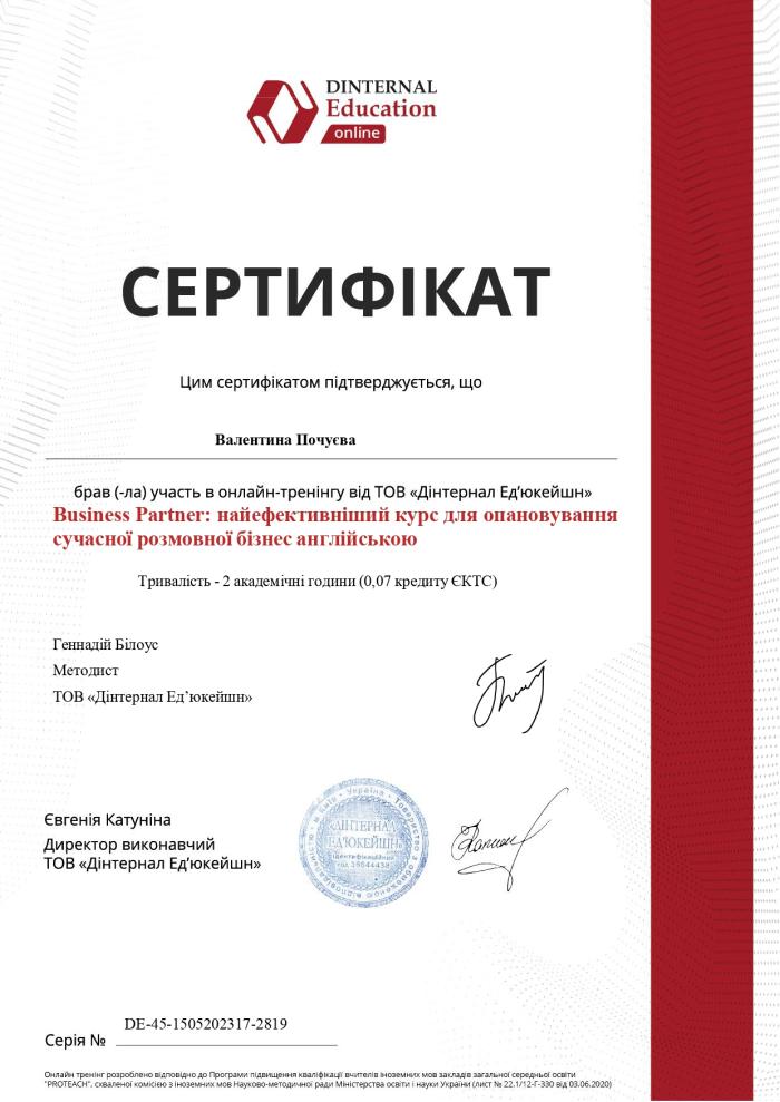 Доцентка кафедри іноземних мов факультету № 4 ХНУВС Валентина Почуєва взяла участь у Міжнародному онлайн-тренінгу «Business Partner: найефективніший курс для опановування сучасної розмовної бізнес англійської» від Міжнародного освітнього центру Dinternal Education.