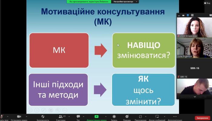 У межах заходу психологи УВП та СІЗО ознайомилися з ознаками, особливостями та мотивами залежної поведінки, проявами невмотивованості до змін і до отримання медико-психологічної допомоги, яка стає підставою застосування саме мотиваційного консультування для даного контингенту осіб. З учасниками заходу також обговорили стадії готовності до змін залежних осіб, ризики та причини рецидивів, основні принципи, етапи, прийоми та техніки, що застосовуються у межах мотиваційного консультування. Розповідь лекторів супроводжувалося презентацією, прикладами з практики, демонстрацією фрагментів навчальних фільмів.